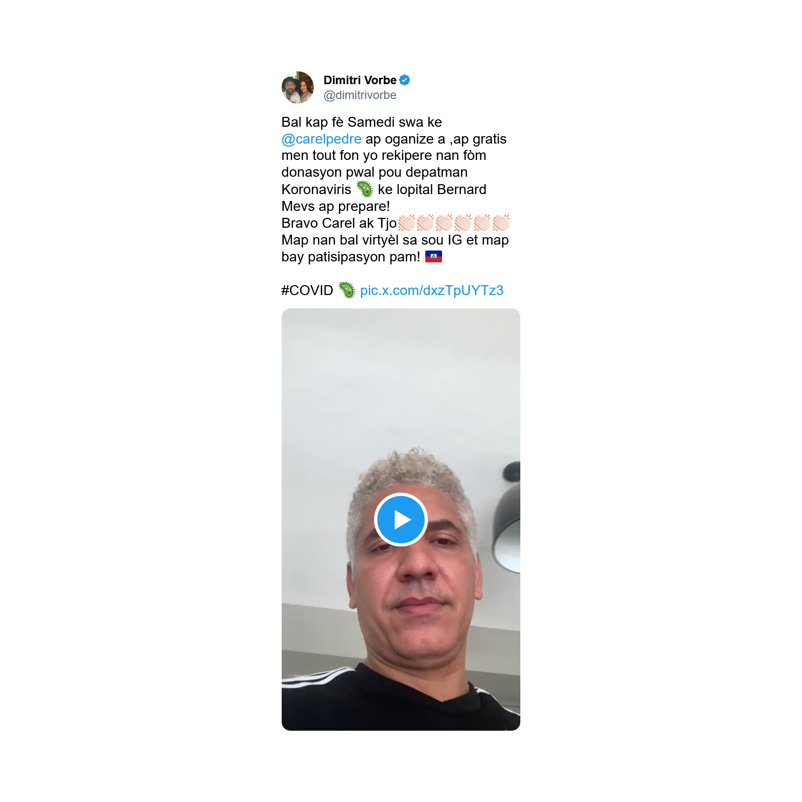 Bal kap fè Samedi swa ke @carelpedre ap oganize a ,ap gratis men tout fon yo rekipere nan fòm donasyon pwal pou depatman Koronaviris ke lopital Bernard Mevs ap prepare! Bravo Carel ak Tjo Map nan bal virtyèl sa sou IG et map bay patisipasyon pam!